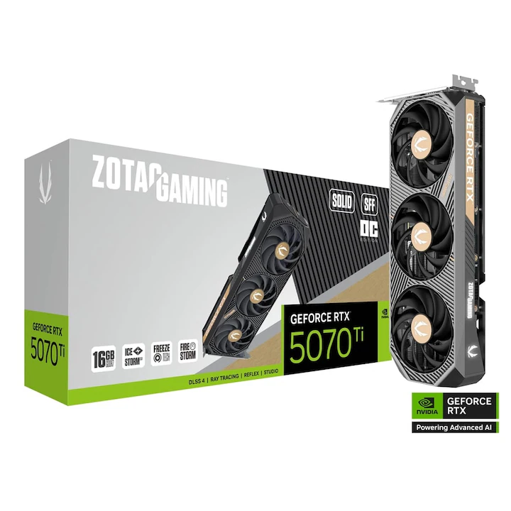 ZOTAC GAMING GeForce RTX 5070 Ti SOLID SFF este o placa grafica de inalta performanta, construita pe arhitectura Blackwell de la NVIDIA, proiectata pentru gaming si creatie de continut. Dispune de DLSS 4, grafica imbunatatita prin inteligenta artificiala si un cadru metalic central ranforsat, facandu-l o alegere durabila si puternica pentru pasionati.